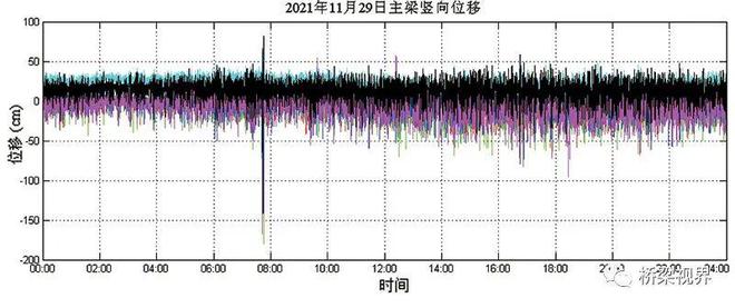 在道路上,车辆事故导致的交通拥堵是较为常见的现象,当交通拥堵发生在桥梁上时,短时间内交通荷载的变化会产生较为明显的结构响应。下文以2021年11月份一次大挠度中BD传感器子系统获取的主梁位移的变化情况为例,进行数据分析。